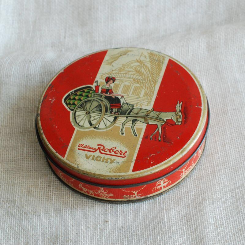 馬車に乗った女性が中央に描かれた、château Robert Vichy と書かれた缶です。