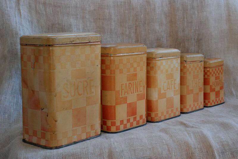 SUCREお砂糖 FARINE小麦粉 CAFEコーヒー THE紅茶 POIVREこしょう と書かれた缶です。