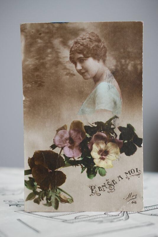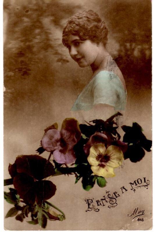 パンジーのバックに薄いブリーのドレスを着た女性がいます。