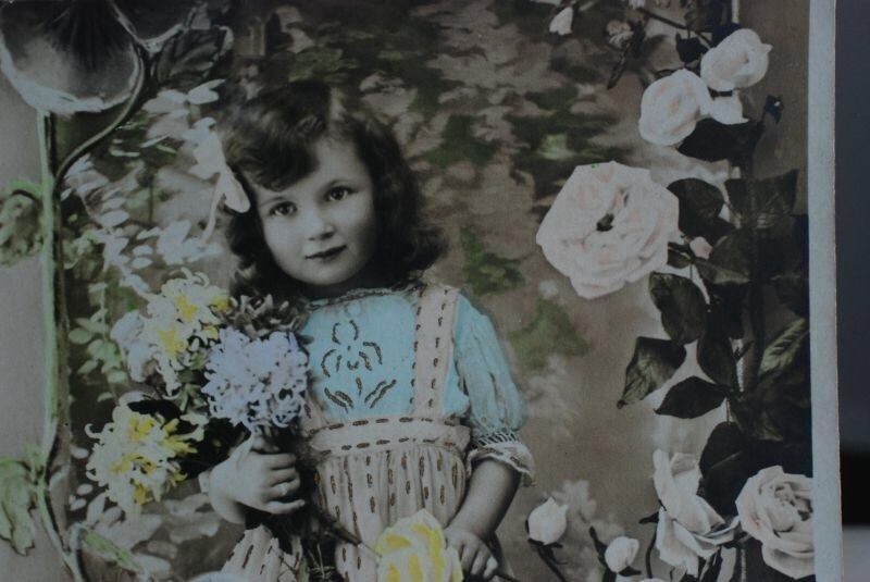 1908年 パンジーと少女 アンティークポストカード