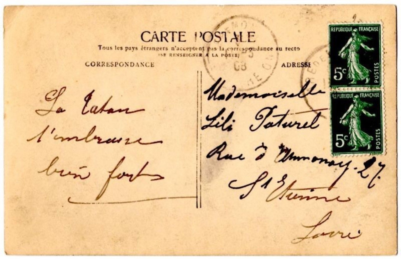 消印から1908年に投函されたものです。
