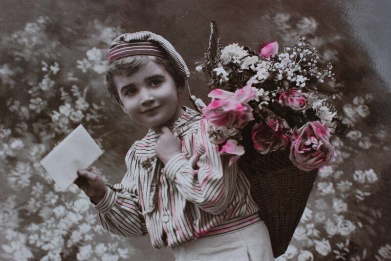 1910年前後 Bonne Féte お花に囲まれた少年 アンティークポストカード
