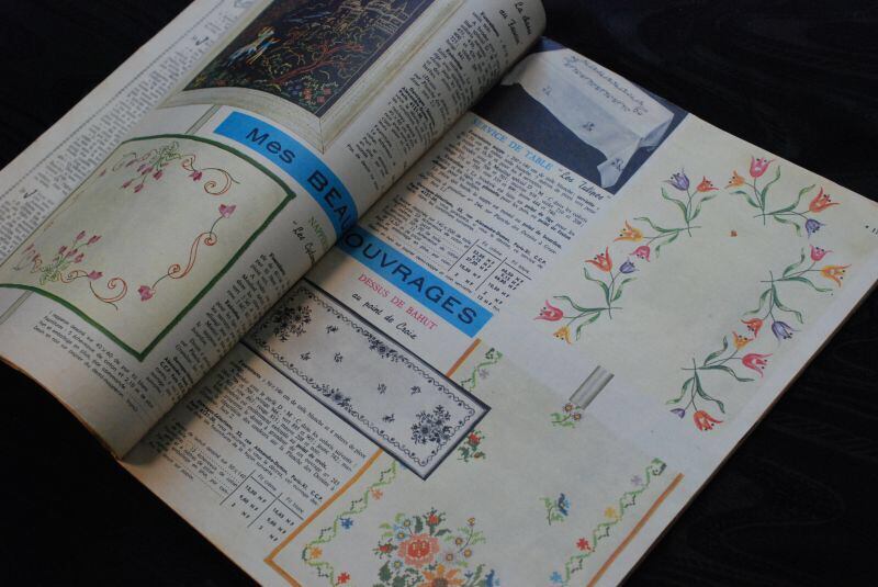 ”読み物”と”刺繍編み物の作り方や図案・作品例”が、半々ぐらいで載ってあります。