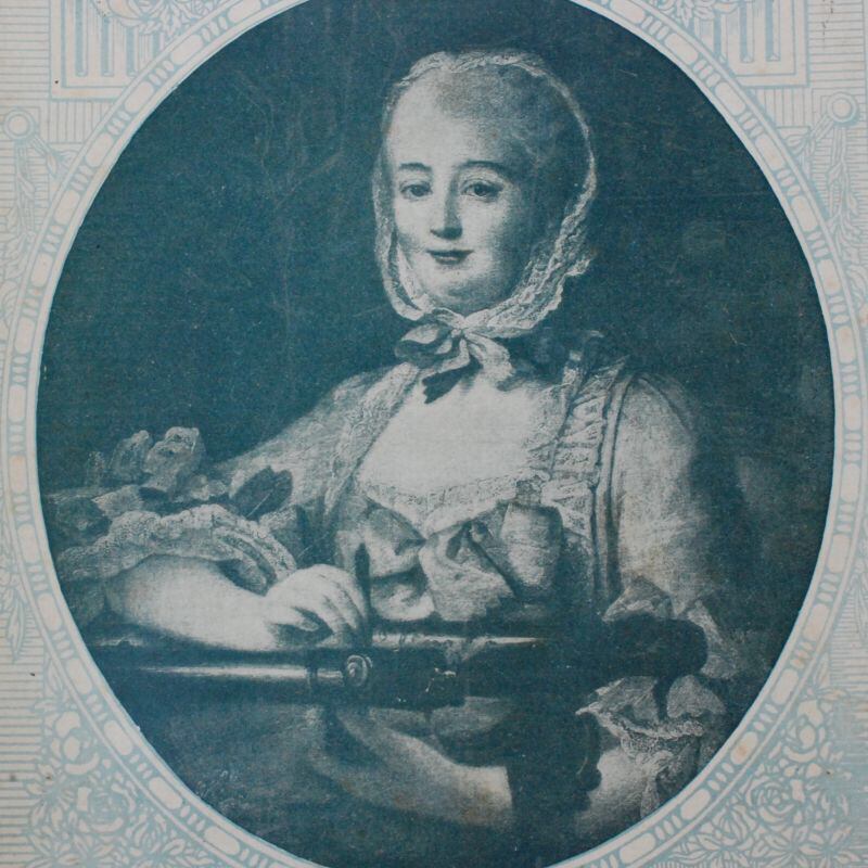 表紙には、女性がメティエの前に座って刺繍をして微笑んでいる様子が描かれています。