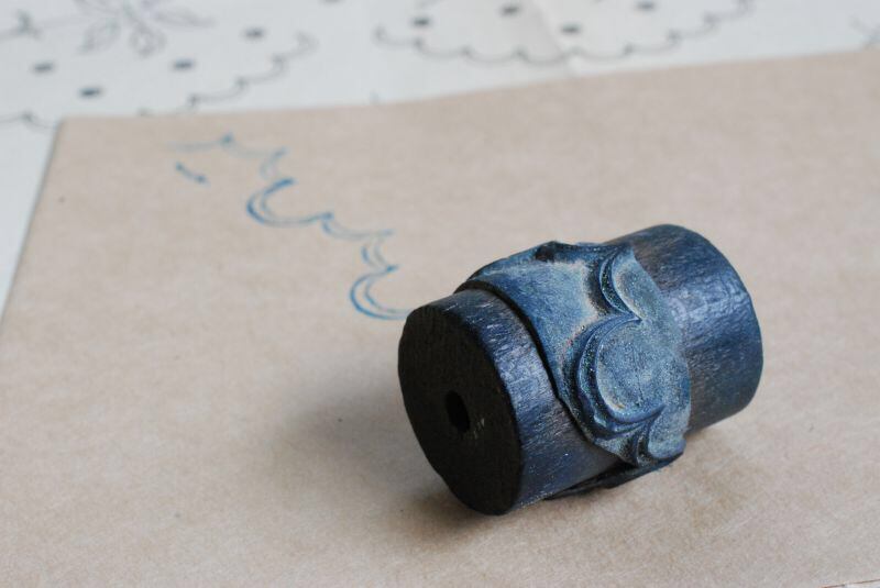 とても硬い円柱の木材に、ゴム印が巻かれています。