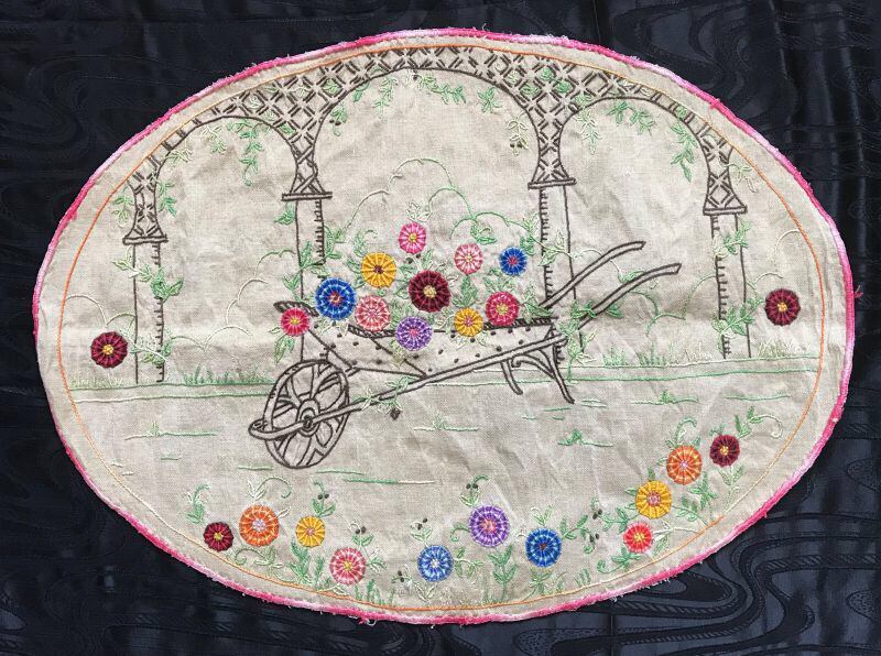 とても古いリネン生地に手押し車を中心に、庭の風景が描かれています。