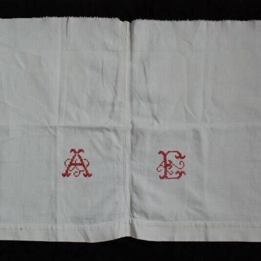 シーツに刺繍されたものでしょう。中央につなぎ目がある為とても古い物と思われます。