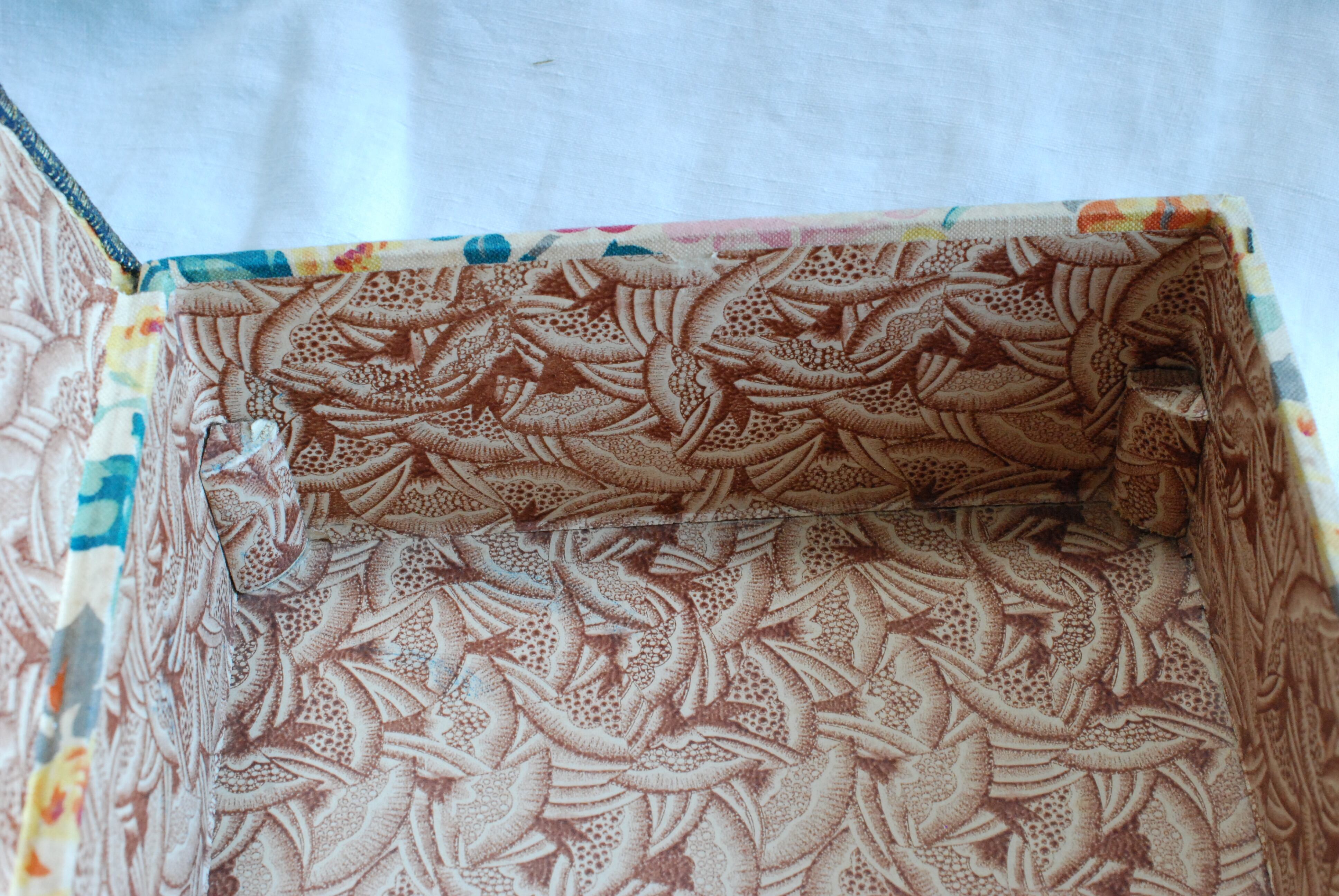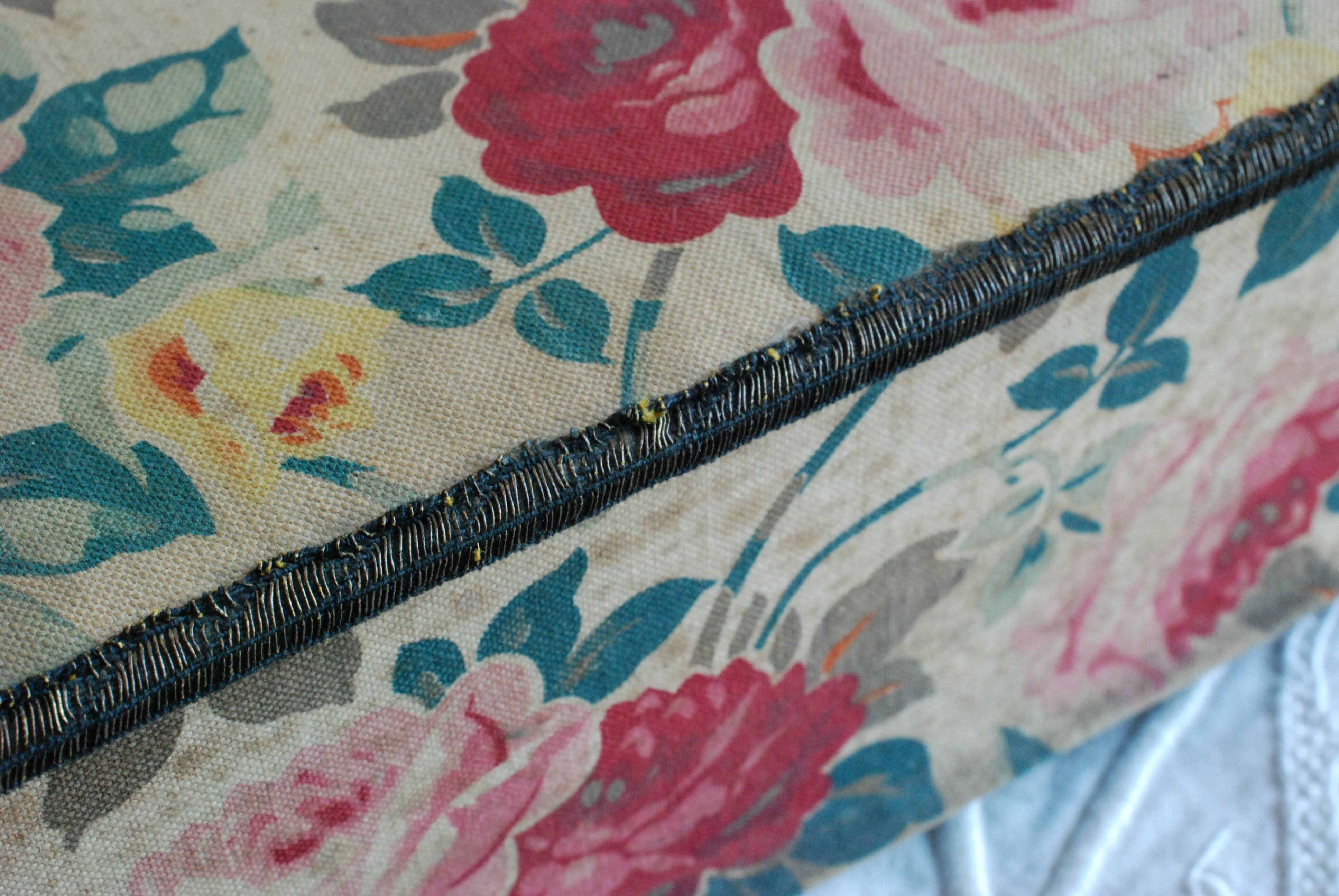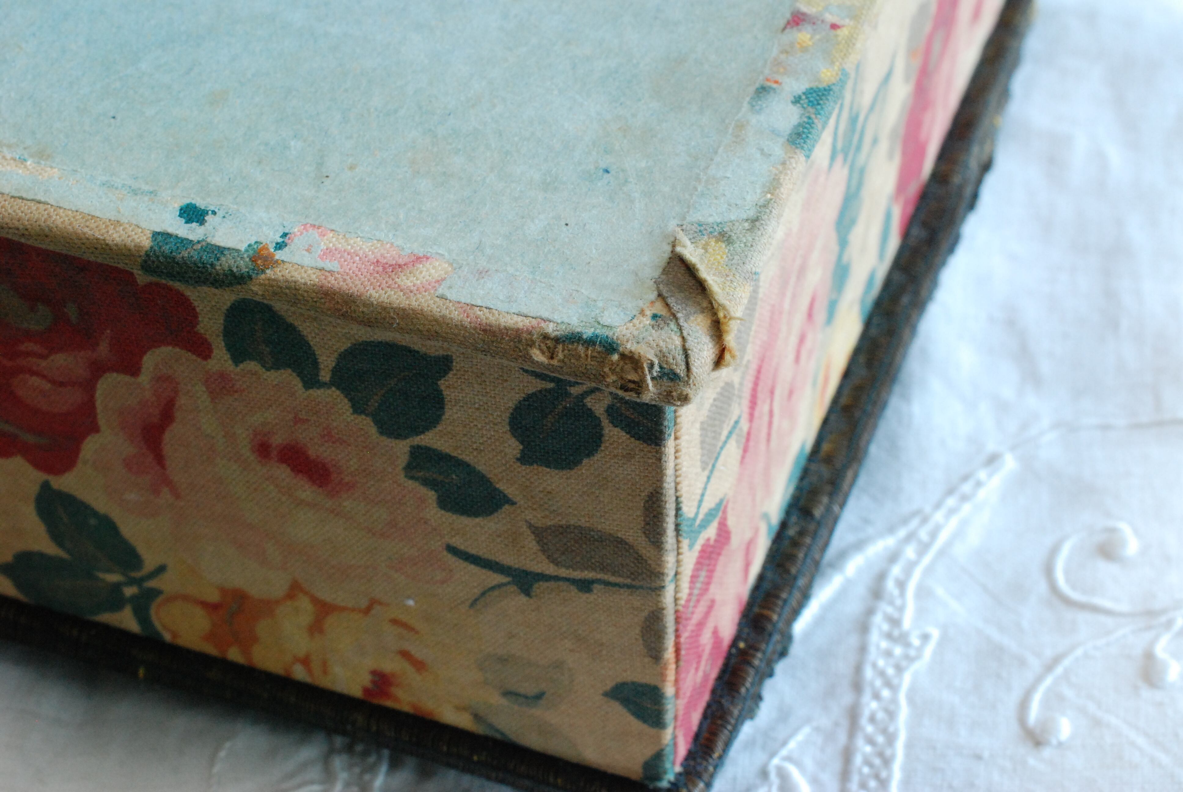 経年によるシミが生地に、蓋の周のリボンにめくれが見られます。(写真参照)