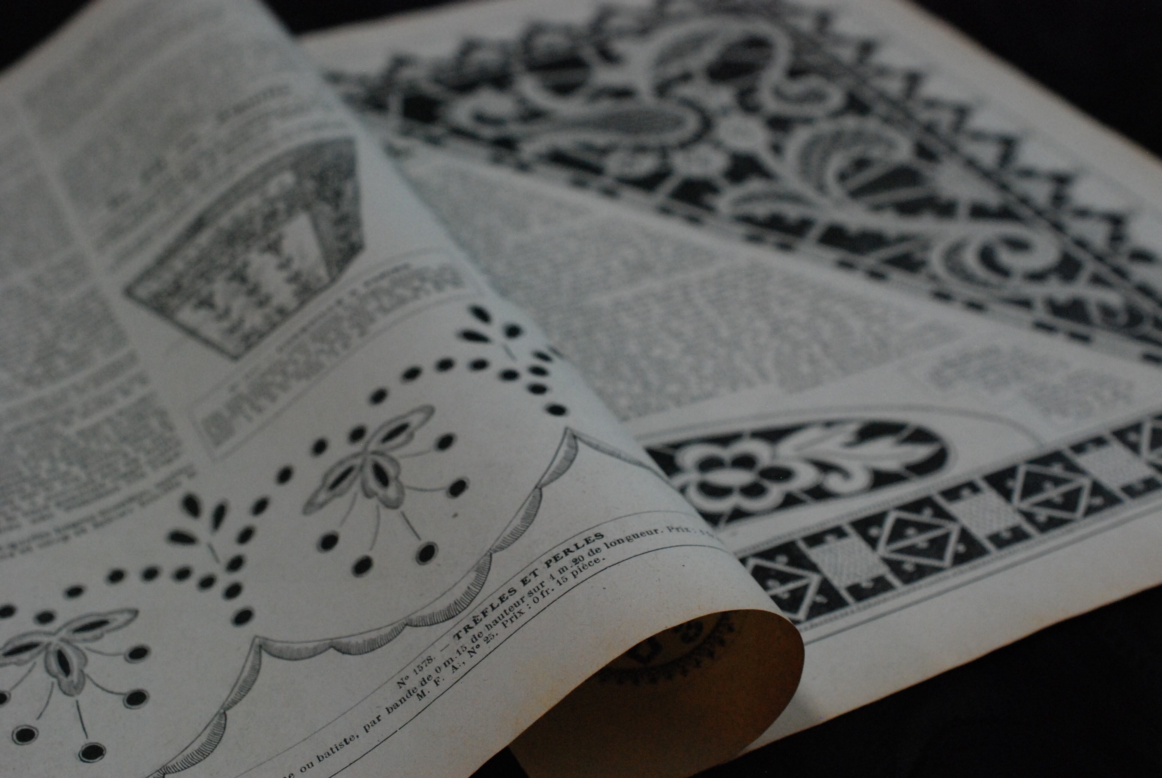 フィレレース、カットワーク、白糸刺繍などの図案や作品例が紹介されています。